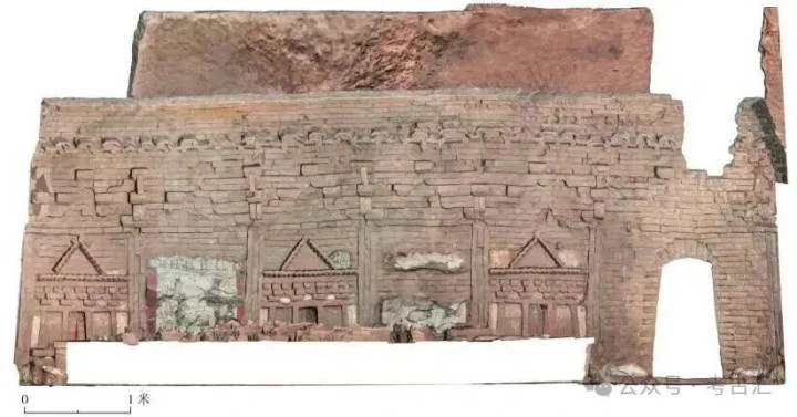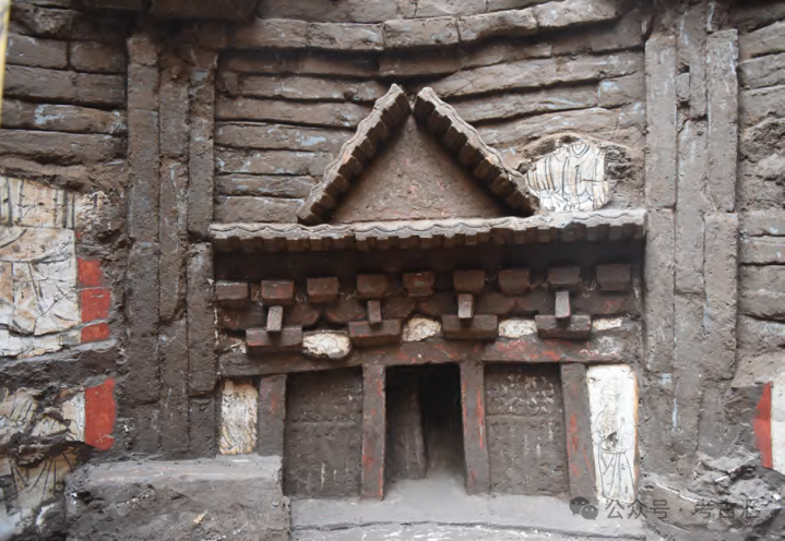 该墓葬为仿木构砖雕壁画墓,墓葬坐北朝南,由墓道、甬道和墓室三部分组成。墓葬装饰采用砖雕和彩绘相结合手法。